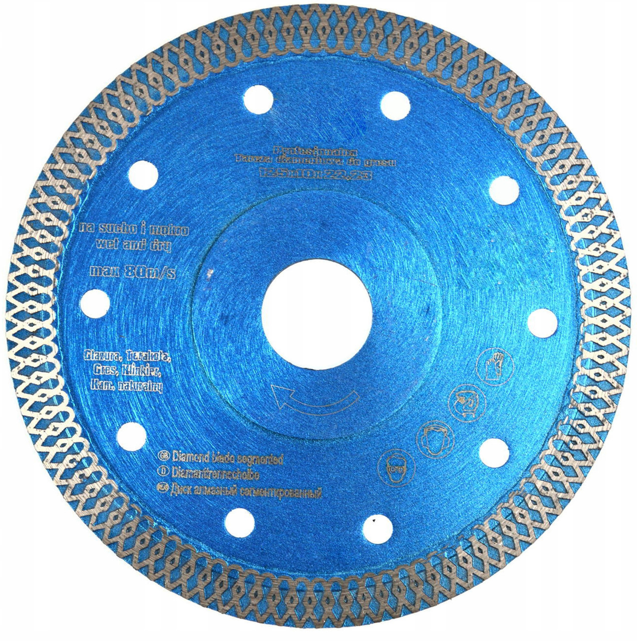 Універсальний алмазний диск, призначений для різання граніту, мармуру, кераміки та теракоти за допомогою ручних шліфувальних машин сухого різання з насадкою 22,23 мм.